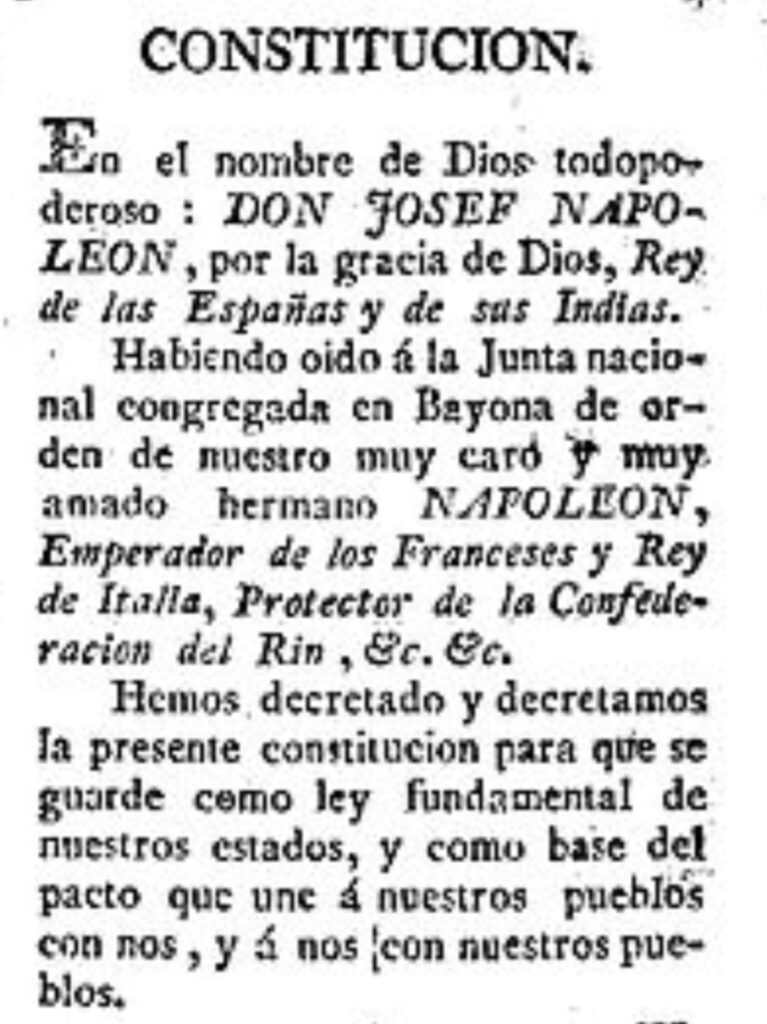 Fue la primera Constitución española, en este caso redactada por franceses e impuesta a la fuerza.