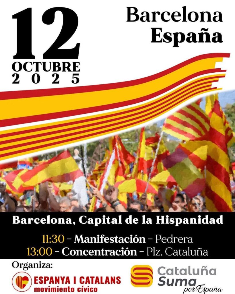 Como cada 12 de octubre, el Movimiento Cívico «Espanya i Catalans» organiza en la ciudad de Barcelona la concentración para celebrar el Día de la Hispanidad con la cooperación de las asociaciones civiles, entidades hispanoamericanas y partidos políticos constitucionalistas de la ciudad.
